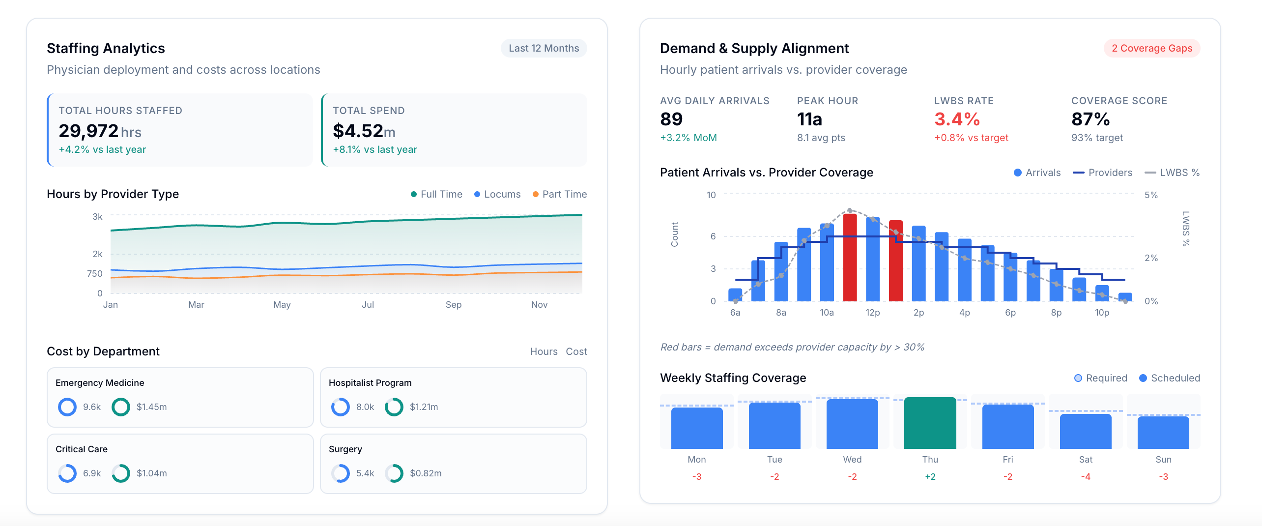 Key staffing decisions are often made by schedulers, department heads, and medical directors juggling trade-offs manually. That creates local, reactive decision-making instead of a unified system-level allocation approach.