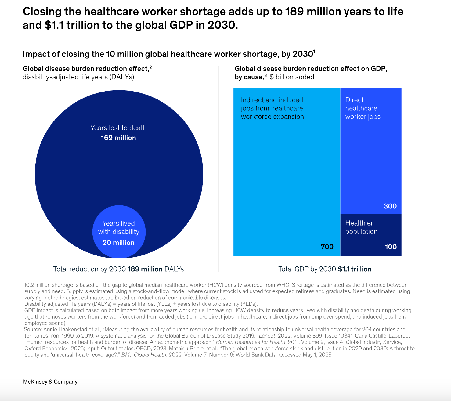 Solving the global healthcare labor shortage (at least 10 million workers by 2030) would be one of the highest-leverage “infrastructure” upgrades society can make: McKinsey Health Institute estimates it could eliminate about 7% of the world’s total disease burden by enabling more timely access to essential services (from maternal care to chronic disease management), averting ~189 million years of life lost to early death and disability, and lifting global life expectancy by roughly 1.5 years on average (with much larger gains in the hardest-hit regions, especially Africa, which holds ~52% of the shortage and 70%+ of the opportunity to reduce disease burden, where life expectancy could rise by ~7 years).