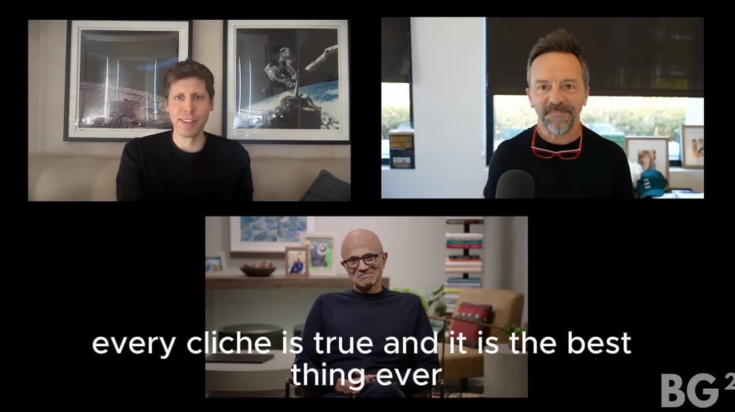 The conversation opens informally with camaraderie between Sam Altman and Satya Nadella, reflecting the deep bond of their partnership.